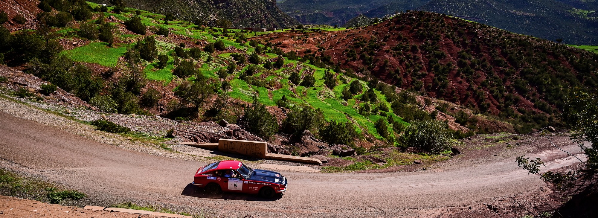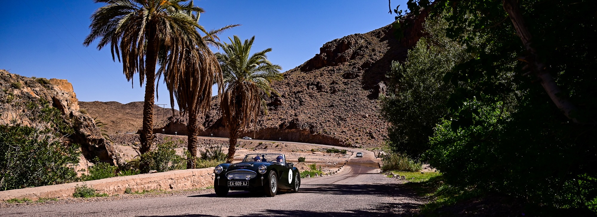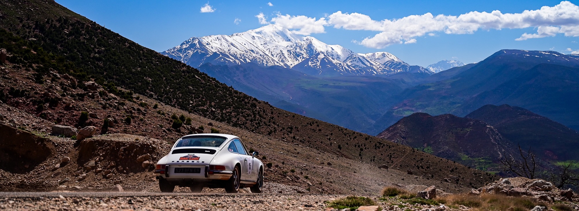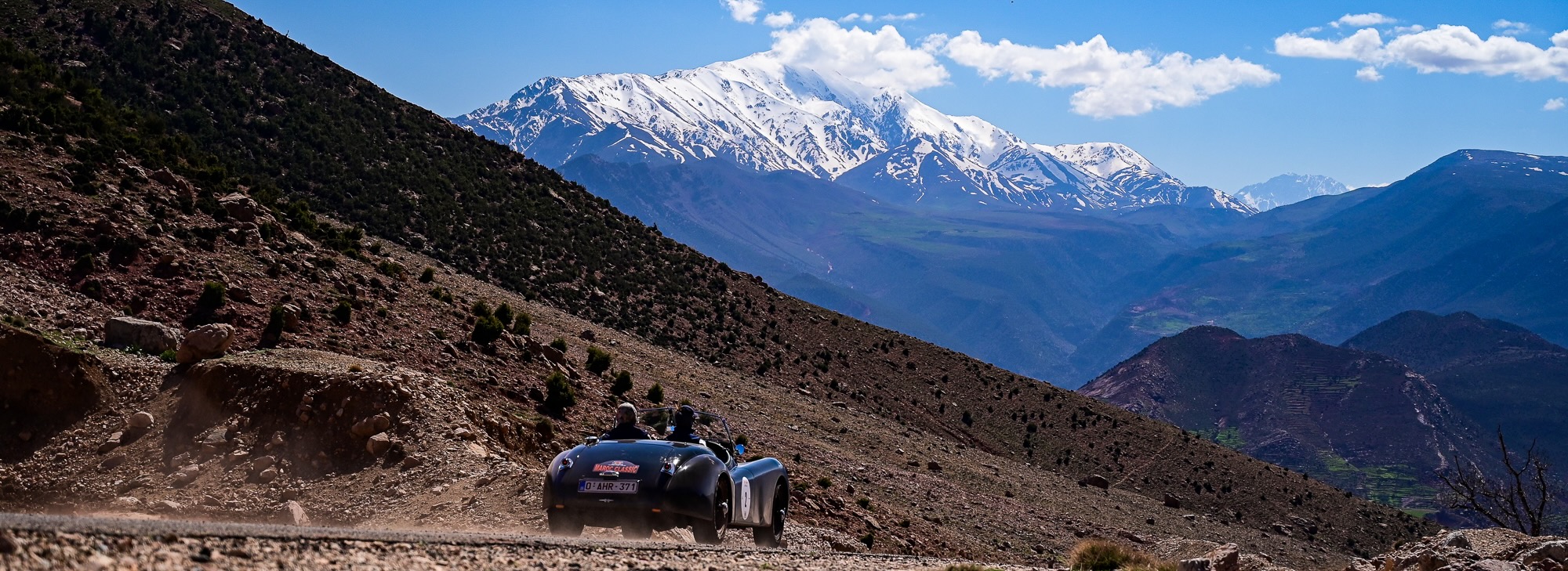 ZR15 et ZR16 – Défis techniques et panoramas majestueux L’après-midi a commencé par la ZR15, sur la route de Télouet, empruntée la veille mais cette fois en sens inverse. Les épingles serrées et les virages techniques ont exigé concentration et régularité, avec la Kasbah du Glaoui et le col du Tizi N’Tichka (2 260 m) en toile de fond. Une petite route au cœur des terres rouges de l’Atlas a ensuite mené à la ZR16, courte mais très technique (3,4 km). Les équipages ont pu profiter de vues exceptionnelles sur le Jebel Toubkal, point culminant du Maroc à 4 167 mètres, dont le sommet enneigé domine majestueusement toute la chaîne de l’Atlas.
