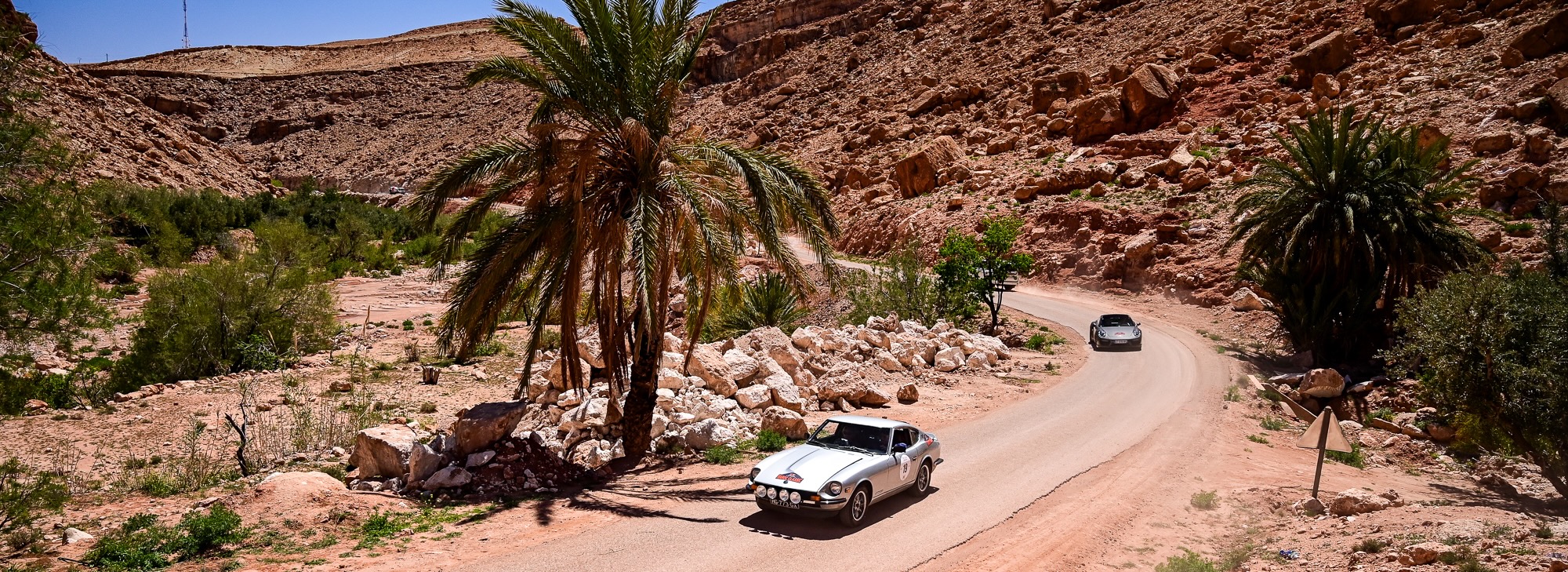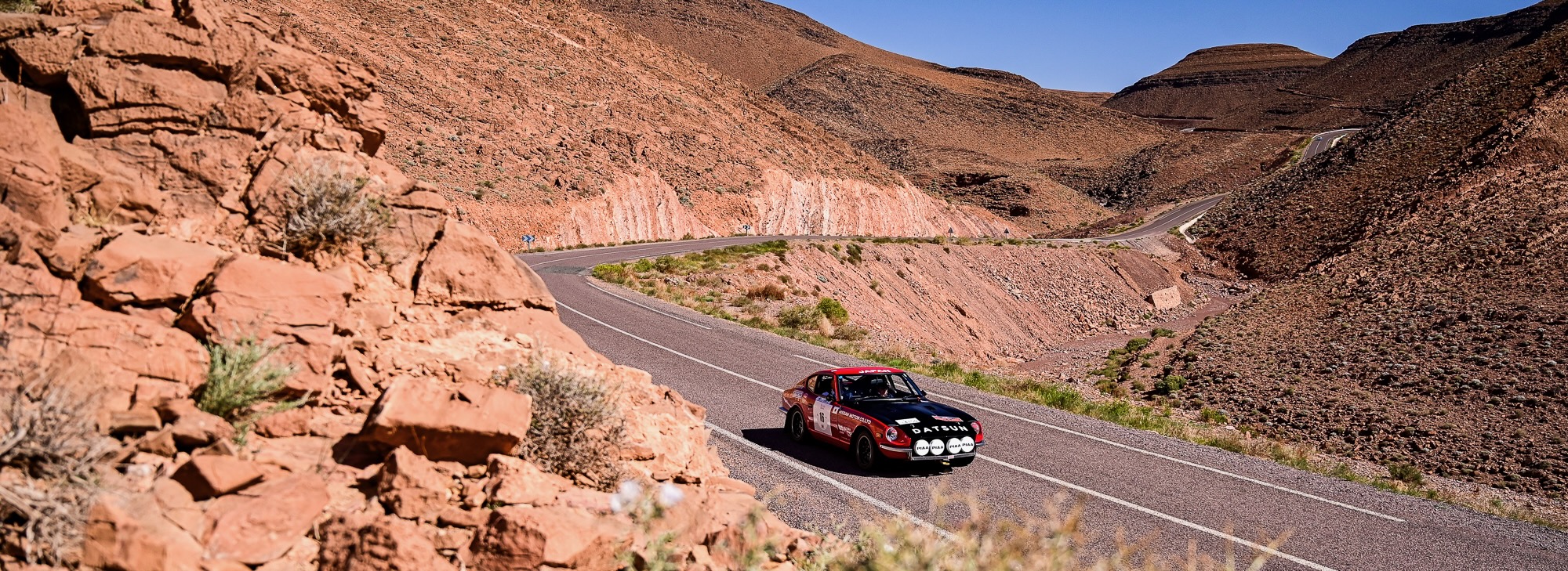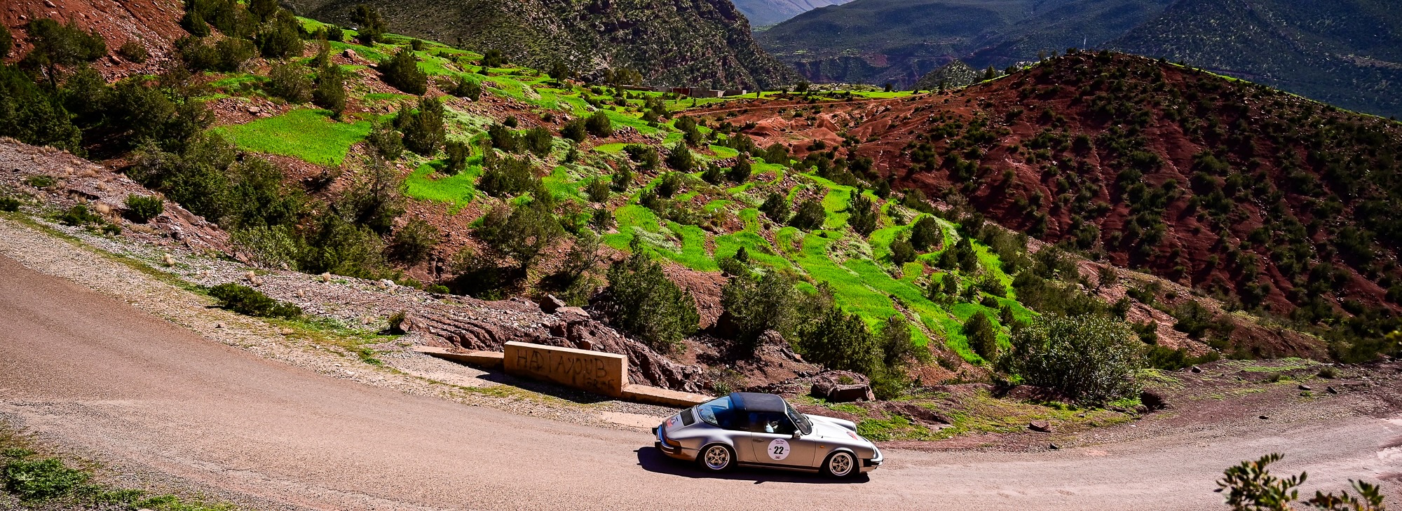 ZR15 et ZR16 – Défis techniques et panoramas majestueux L’après-midi a commencé par la ZR15, sur la route de Télouet, empruntée la veille mais cette fois en sens inverse. Les épingles serrées et les virages techniques ont exigé concentration et régularité, avec la Kasbah du Glaoui et le col du Tizi N’Tichka (2 260 m) en toile de fond. Une petite route au cœur des terres rouges de l’Atlas a ensuite mené à la ZR16, courte mais très technique (3,4 km). Les équipages ont pu profiter de vues exceptionnelles sur le Jebel Toubkal, point culminant du Maroc à 4 167 mètres, dont le sommet enneigé domine majestueusement toute la chaîne de l’Atlas.